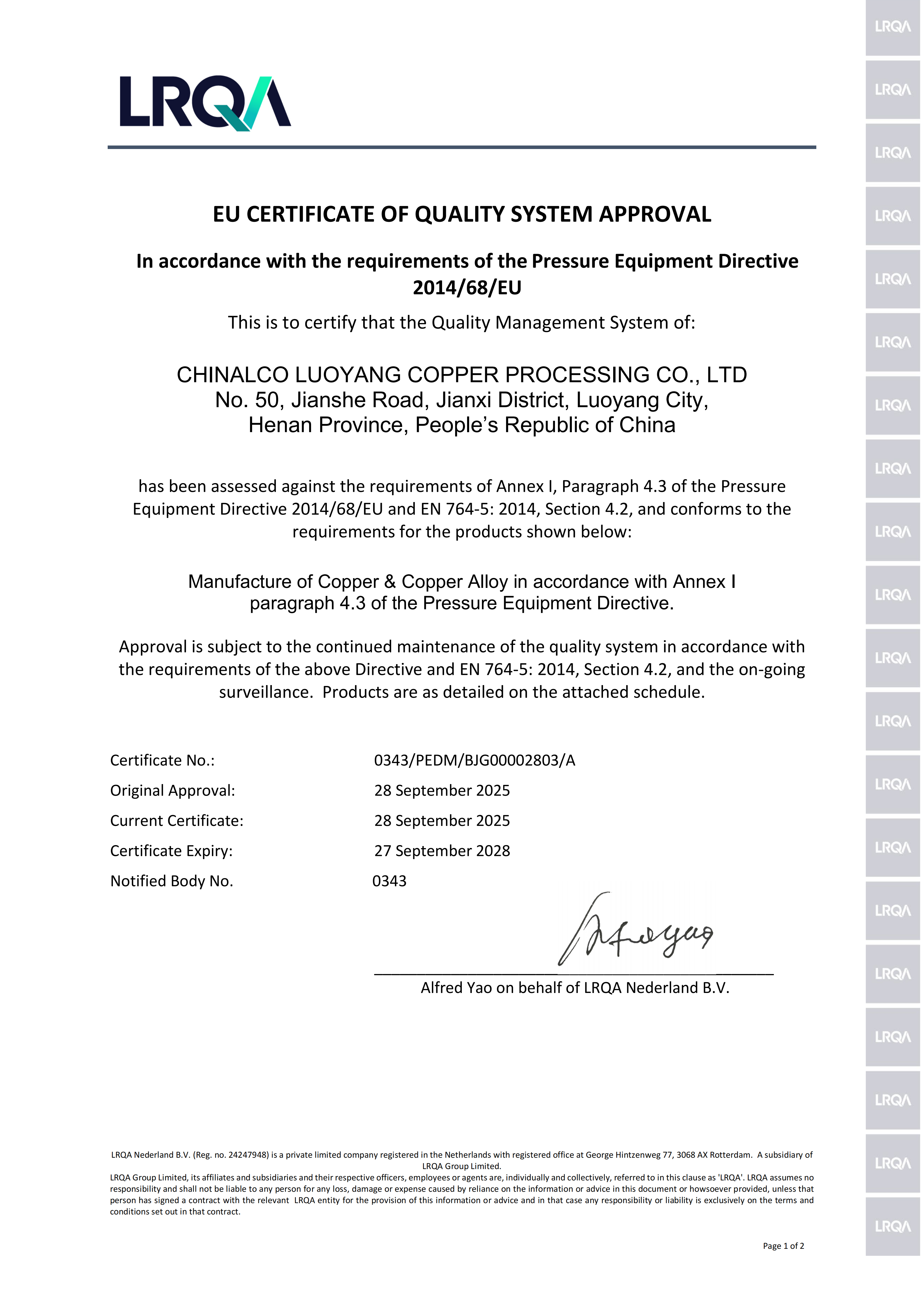 近日,洛阳铜加工顺利通过欧盟压力设备认证(PED)质量管理体系审核,并获得认证证书。这标志着洛阳铜加工在压力设备用铜及铜合金产品的设计、制造及全流程质量管理体系方面,已达到欧盟国际标准要求,成功拿到进......